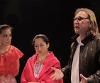 Jorge Cano, María Gaviria y Juan David Ossa en los personajes protagónicos y la participación especial del Quinteto de Cámara y coro de la Alianza Francesa durante el estreno de la obra teatral en el teatro Pablo Tobón Uribe de Medellín, bajo la dirección de Pedro Oscar Pérez,